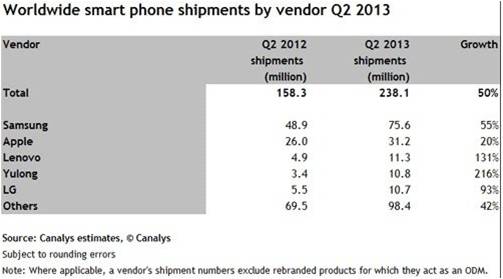 Canalys發布的報告顯示,今年第二季度,三星和蘋果智能手機出貨量的同比增幅分別達到55%和20%,占據出貨量排名前兩位;而聯想、宇龍和LG則分列三到五位。第二季度,中國排名前五的智能手機生產商(聯想、宇龍酷派、華為、中興和小米)在今年第二季度的出貨量占到了全球總出貨量的20%,去年同期該份額不足15%。