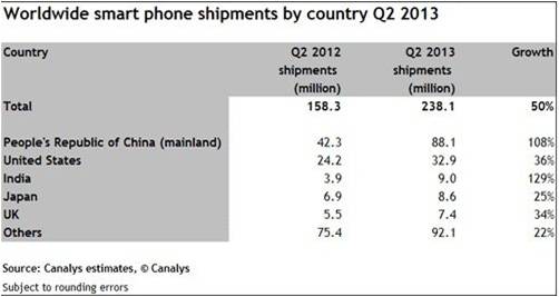北京時間8月6日消息,據國外媒體報道,全球著名市場研究機構Canalys周一公布了今年第二季度全球智能手機出貨量調查報告。報告顯示,今年第二季度,全球智能手機出貨量約為2.381億部,同比增幅達到驚人的50%。中國市場的手機銷量目前已占全球手機銷量的20%,這主要得益于中國大批量生產的低價智能手機銷量的猛增。