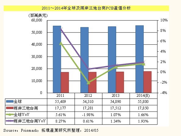全球PCB產(chǎn)業(yè)在歷經(jīng)2012年歐債危機(jī)與全球經(jīng)濟(jì)低迷的谷底后,2013年隨著消費(fèi)市場(chǎng)回溫,開始往上翻轉(zhuǎn),但PC產(chǎn)業(yè)持續(xù)受到移動(dòng)設(shè)備崛起的影響,2013年P(guān)C出貨量仍然持續(xù)下滑。雖然移動(dòng)設(shè)備成長(zhǎng)快速,但傳統(tǒng)大宗用板的PC出貨量持續(xù)衰退,尚未看到谷底,PCB產(chǎn)業(yè)還是難以快速成長(zhǎng)。2013年全球PCB產(chǎn)值為 548.9億美元,較2012年成長(zhǎng)1%。觀察2012~2014年P(guān)CB產(chǎn)值,隨著移動(dòng)設(shè)備持續(xù)成長(zhǎng)及新興應(yīng)用崛起下,可看出PCB產(chǎn)值的增幅已趨于穩(wěn)定,預(yù)估2014年仍呈現(xiàn)持續(xù)溫和的成長(zhǎng)。