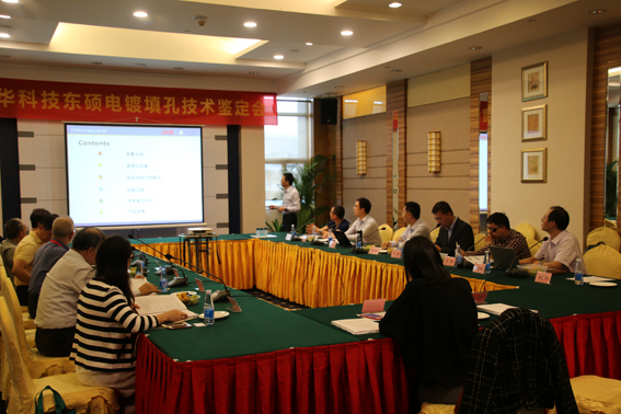 鑒定會議由林金堵教授主持,光華科技董事副總裁鄭韌先生,東碩科技楊應喜總經理、劉彬云總監等出席了鑒定會。會議過程中,劉彬云總監首先介紹了東碩電鍍填孔技術,該技術屬東碩科技的創新自主研發,于2013年1月立項,目前已成功完成產品的預研、小試、中試、以及客試階段測試,測試結果表明本項目研發出的新產品可用于盲孔的電鍍填充過程,能實現盲孔有效、快速的填充,且性能穩定,值得推廣和應用。