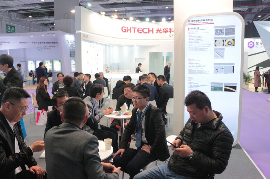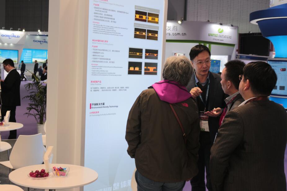 人頭攢動(dòng)的展會(huì)中,光華科技在8.1號(hào)館,8K46號(hào)展臺(tái)迎來了產(chǎn)業(yè)鏈上下游的伙伴們。公司此次特別帶來了面向MSAP制程的專用化學(xué)品及5G相關(guān)技術(shù),以及其他PCB濕制程化學(xué)品的新特性,如超薄面銅填孔,MSAP工藝圖形填孔;耐彎折20次以上的軟板化鎳金;適用于5G信號(hào)傳輸?shù)某零y、沉錫產(chǎn)品;以及最新的沉厚金產(chǎn)品。