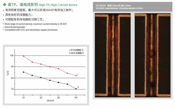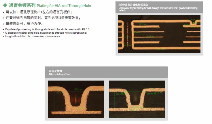 垂直連續(xù)電鍍VCP是為垂直連續(xù)電鍍設(shè)備而開發(fā)的酸性銅鍍體系,適應(yīng)多種板型的電鍍需求,適用高電流密度的通孔電鍍,兼顧沉銅及有機(jī)導(dǎo)電膜等直接電鍍,適用通盲共鍍。